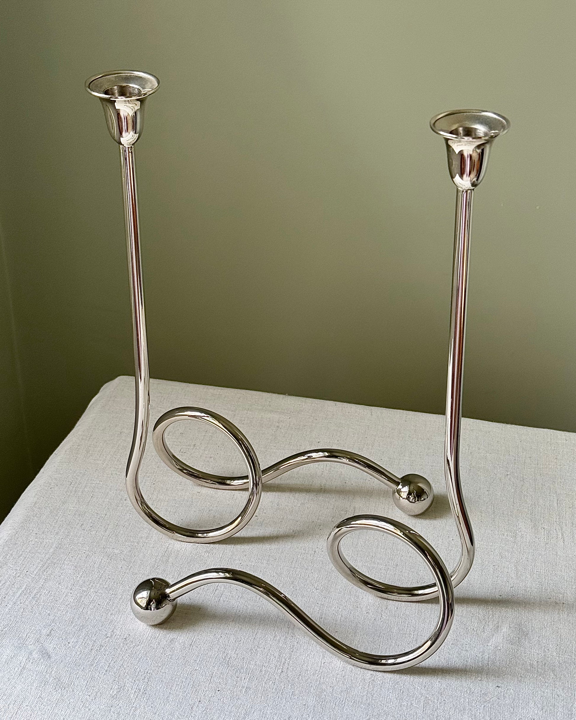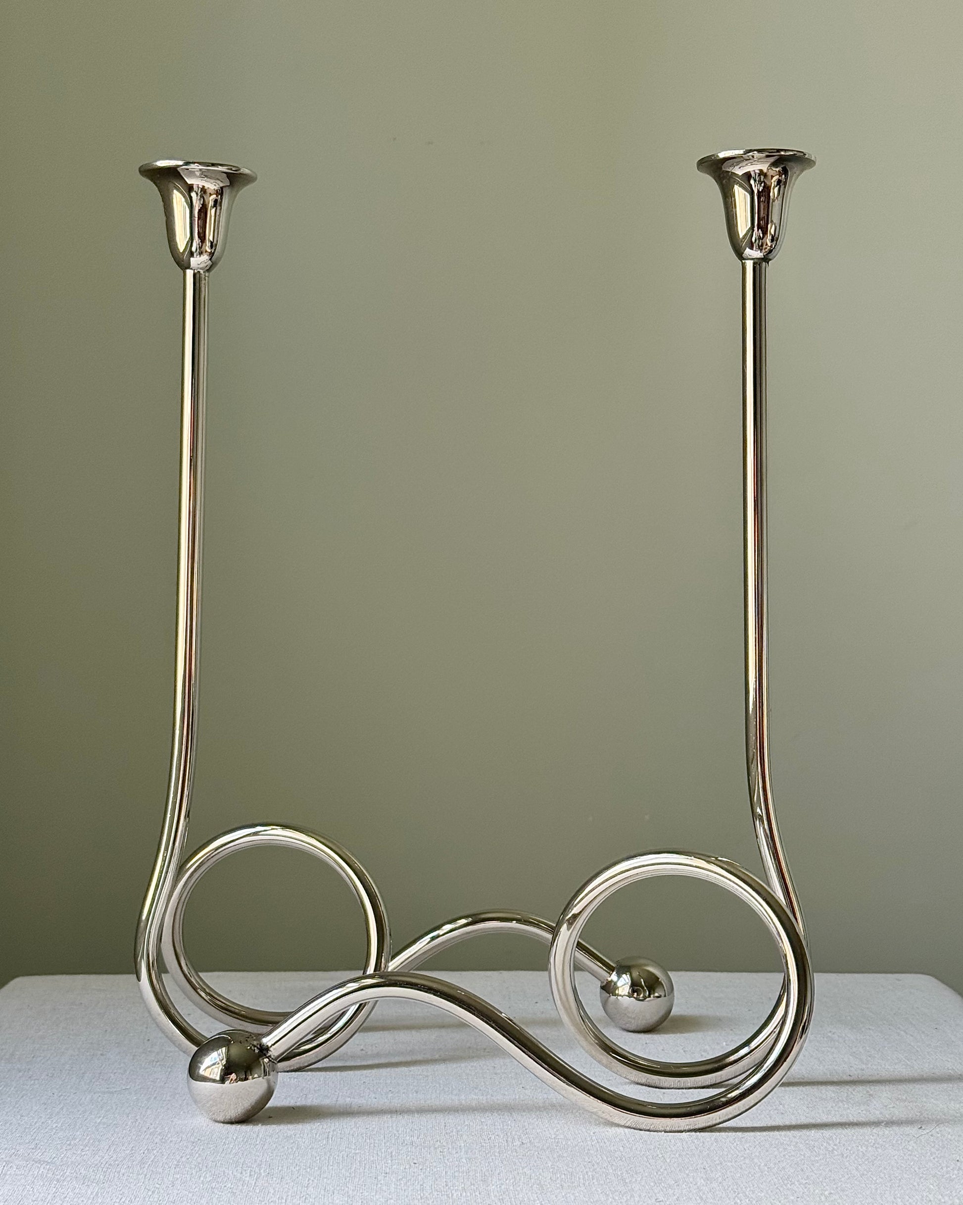 A pair of tall Italian chrome post modern candlesticks in the manner of Guido Niest circa. 1990’s. Each rise from a sculptural looped base with a spherical finial. Would look fantastic either side of a mantelpiece. In good vintage condition.