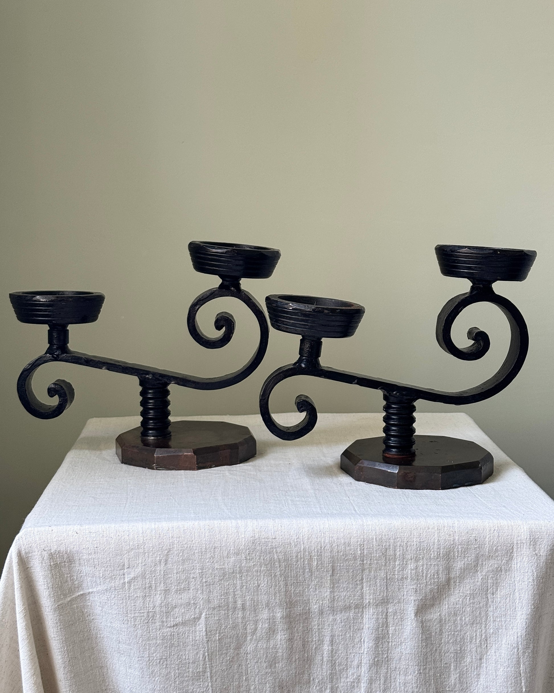 We have one of these unique candelabras with a geometric bronze base and two wrought iron graduated prongs with swirl detailing. These look great as a pair and individually as they are such a stand out art piece in themselves. This is extremely weighty, the price is for one candelabra. French, circa 1950’s.