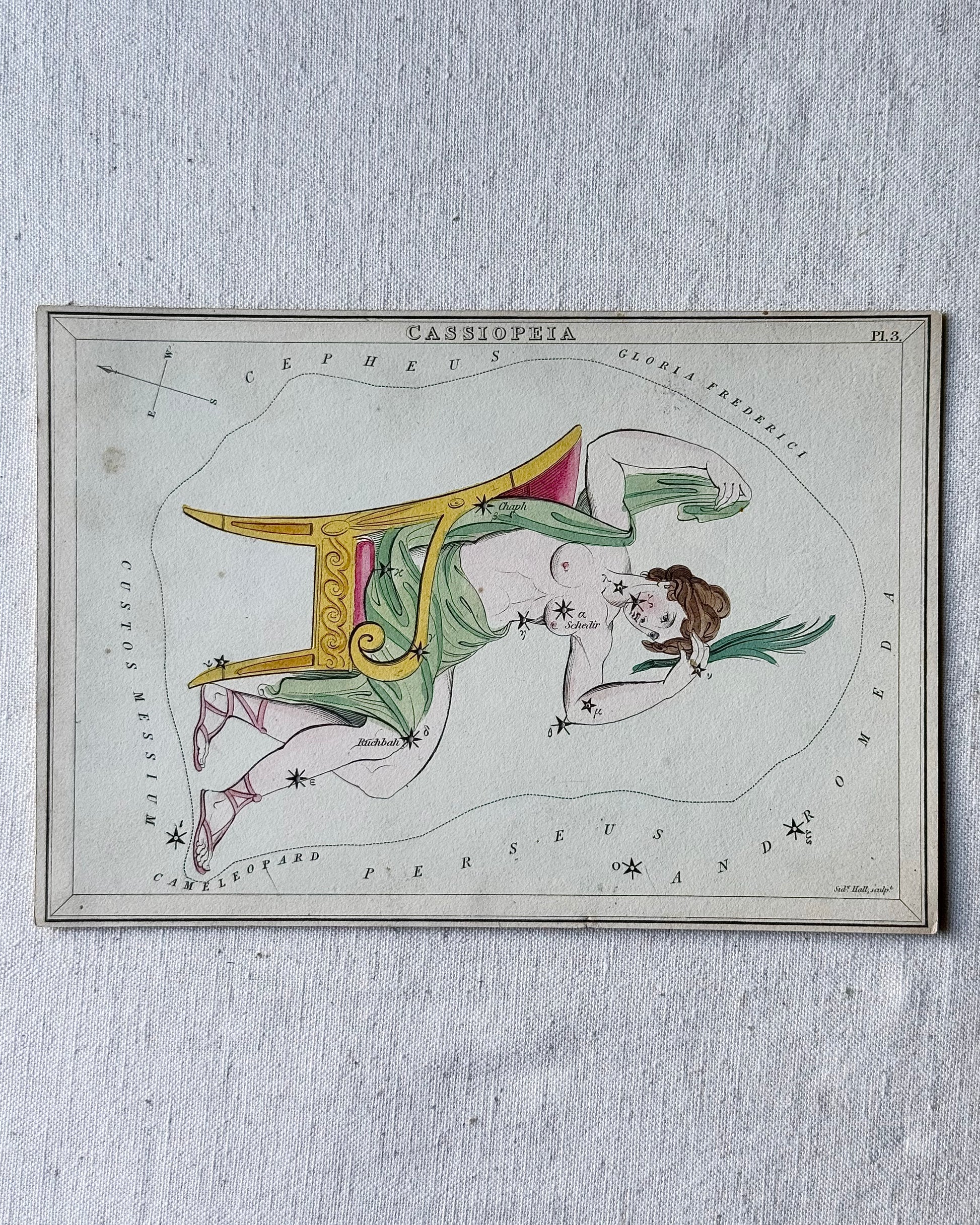 Each chart features a different constellation, beautifully hand-coloured, with fine engraved star positions and mythological figures. Each chart displays the constellation punched with tiny holes, so when held up to a light source, the stars would “shine”.