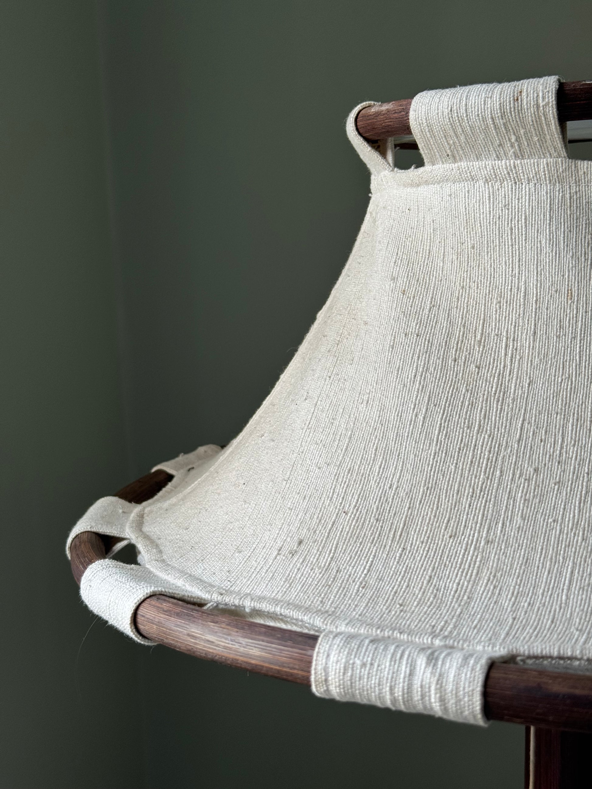 Swedish bentwood table lamp with stitched off-white linen shade, attributed to Anna Ehrner for Ateljé Lyktan, 1970s. The tripod base supports a conical shade formed from canvas panels with brass cross supports. The bulb is encased with frosted acrylic, which contributes to the warm glow it emits when illuminated.