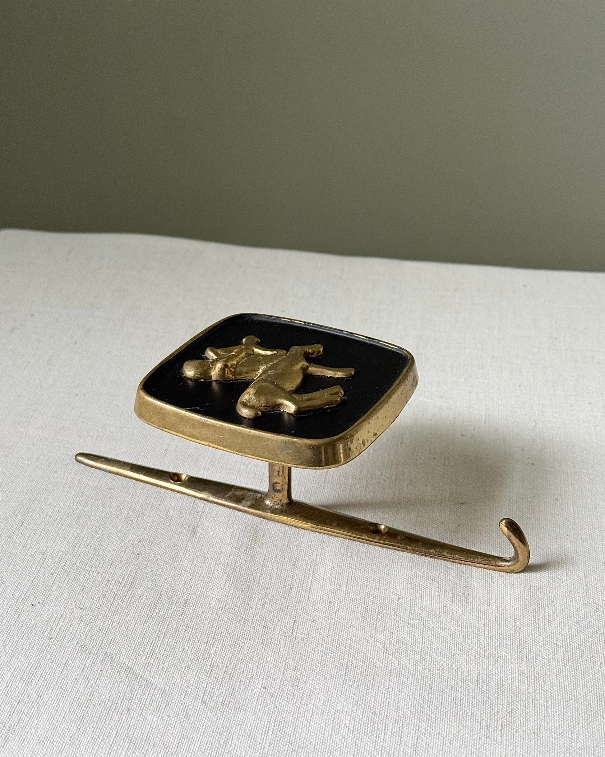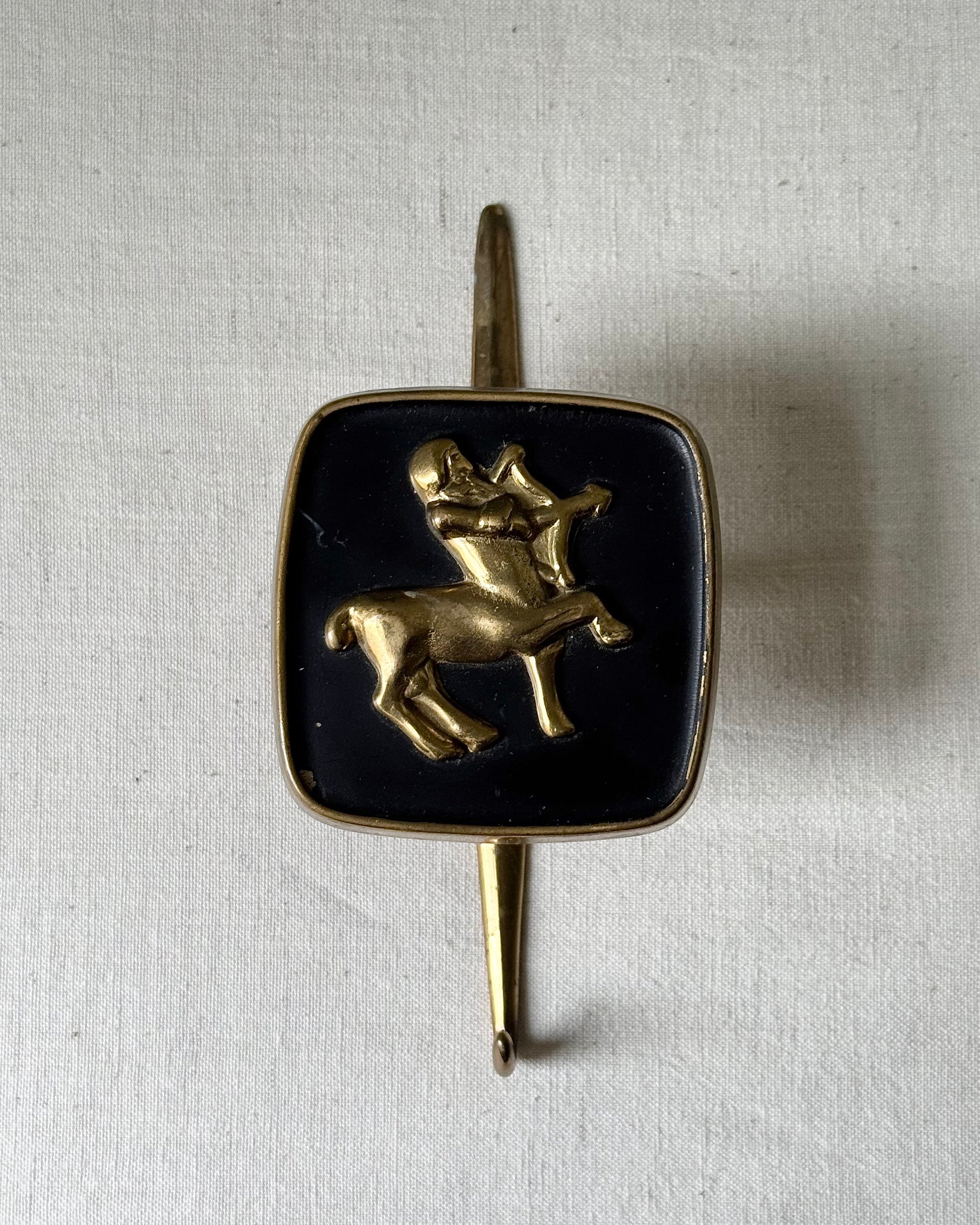 I have three exceptional French mid-century brass wall hooks - Scorpio, Taurus and Sagittarius. Each featuring a brass raised zodiac motif mounted on a black enamel plaque. Beneath this, is the brass hook. Beautiful detail and weighty, reminiscent of Jacques Adnets designs. In good vintage condition with wear aligned with age.