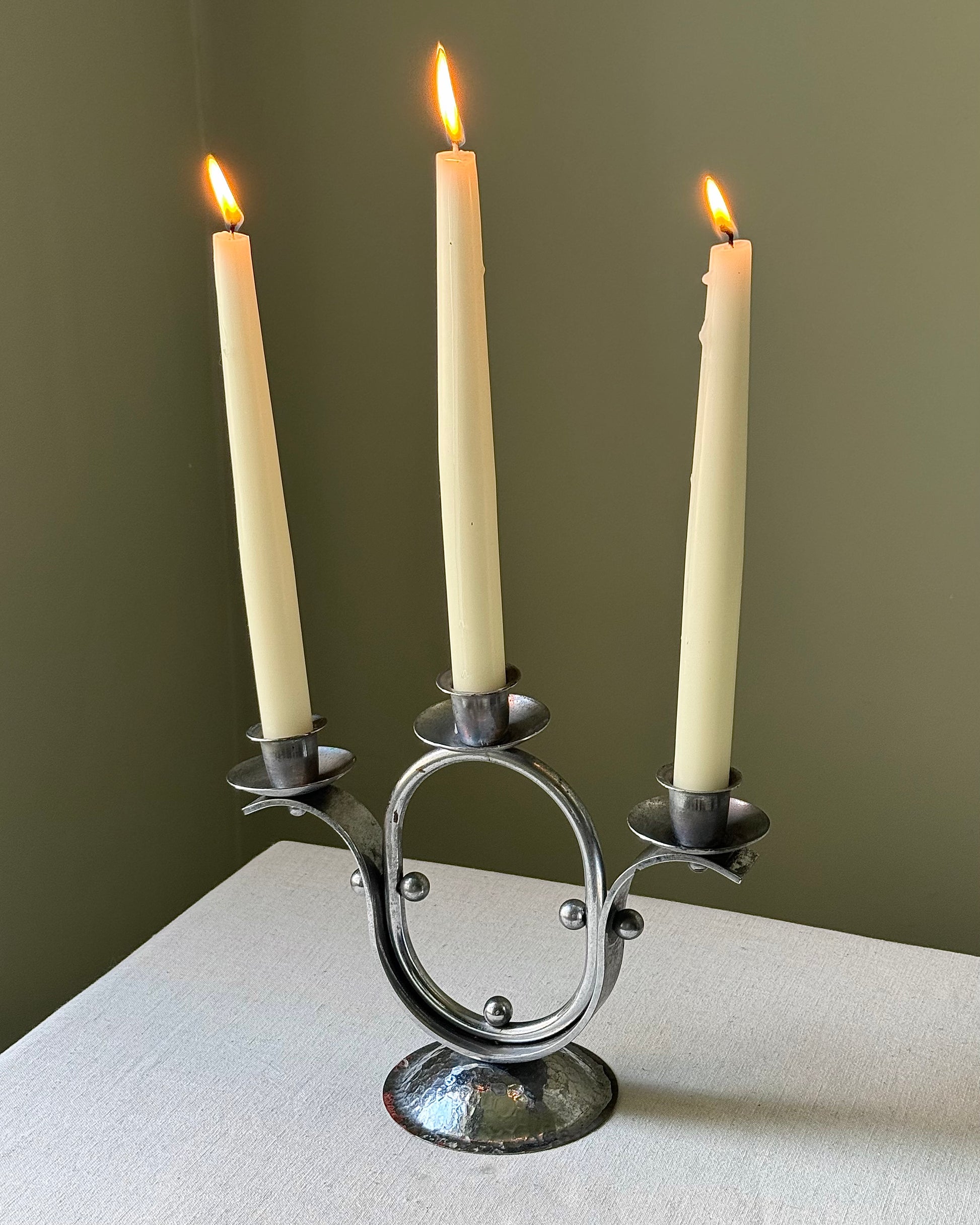 A Dutch Art Deco three arm candelabra in chrome-plated metal, circa 1930s. The sculptural arms feature spherical detailing and hold dinner candles. In good condition, showing signs of wear from age including some areas of flaking to the chrome.