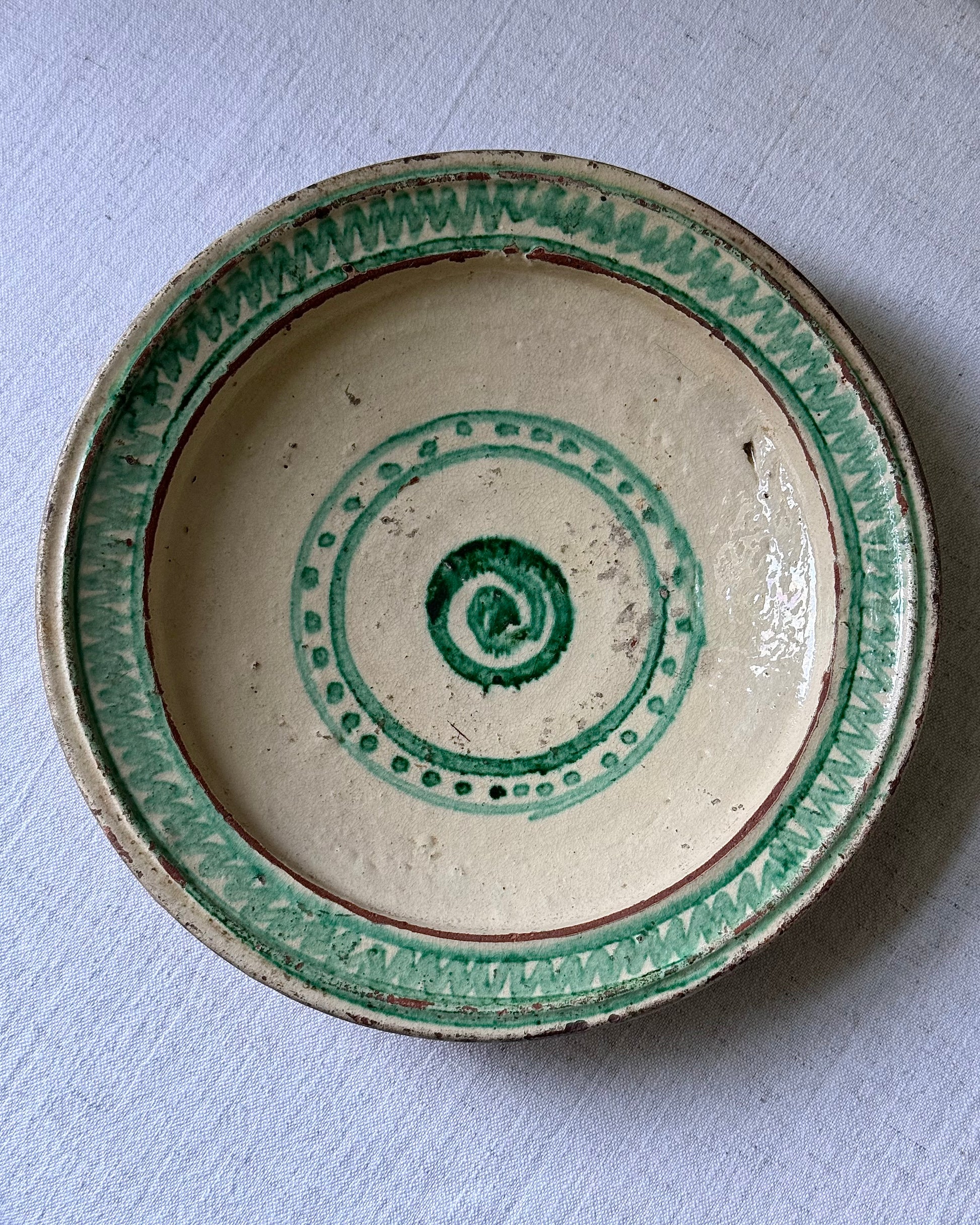 A charming antique Andalusian folk Spanish bowl, hand-thrown with a hand painted green spiral and zigzag border against a cream glaze. Displaying incredible patina, this would look beautiful on a kitchen wall amongst other plates or art.