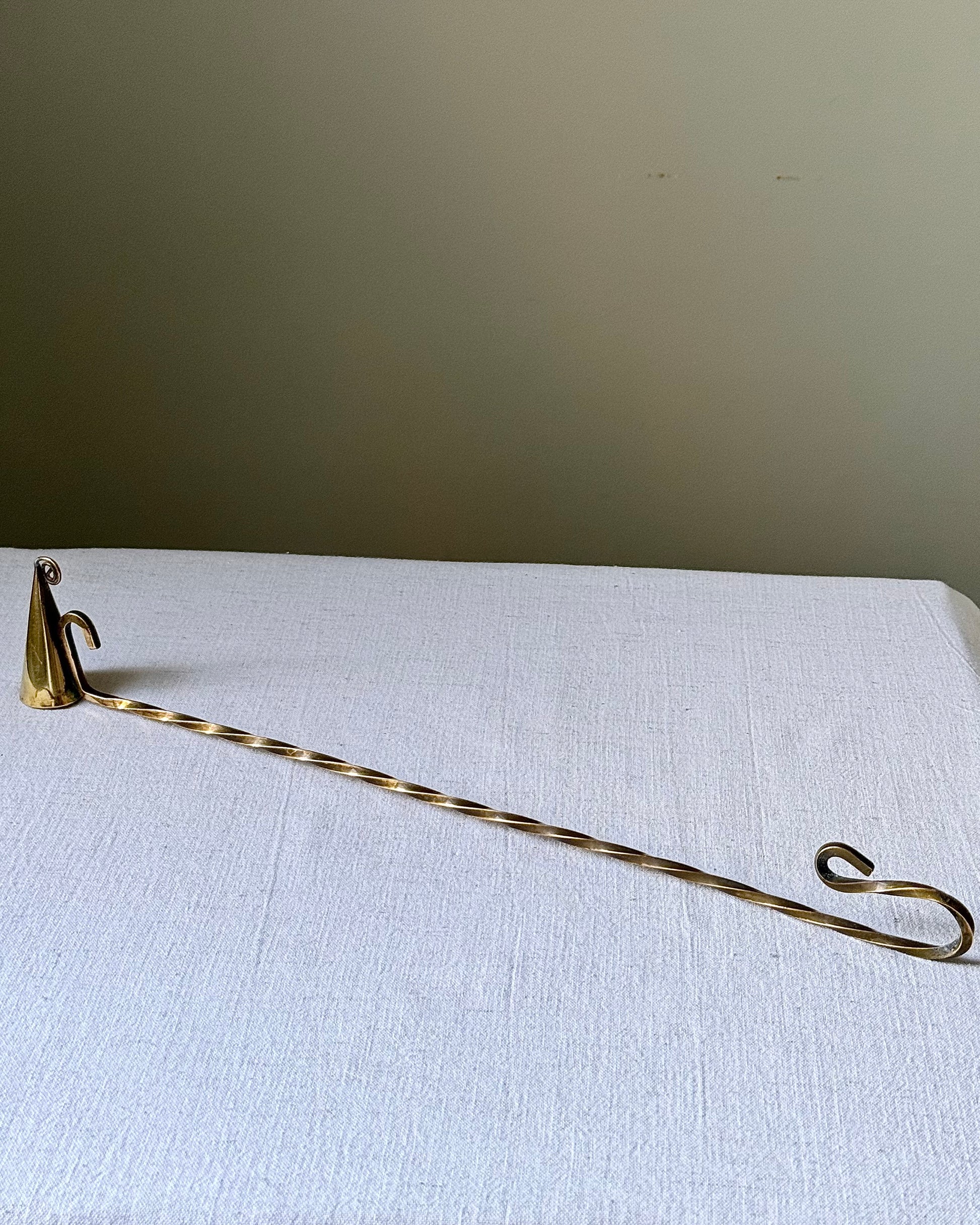 An unusually long brass candle snuffer, Swedish likely mid-century. Featuring a twisted stem with a conical snuffer finished with a tiny scroll finial. Equally practical and beautiful styled on a mantel or coffee table.
