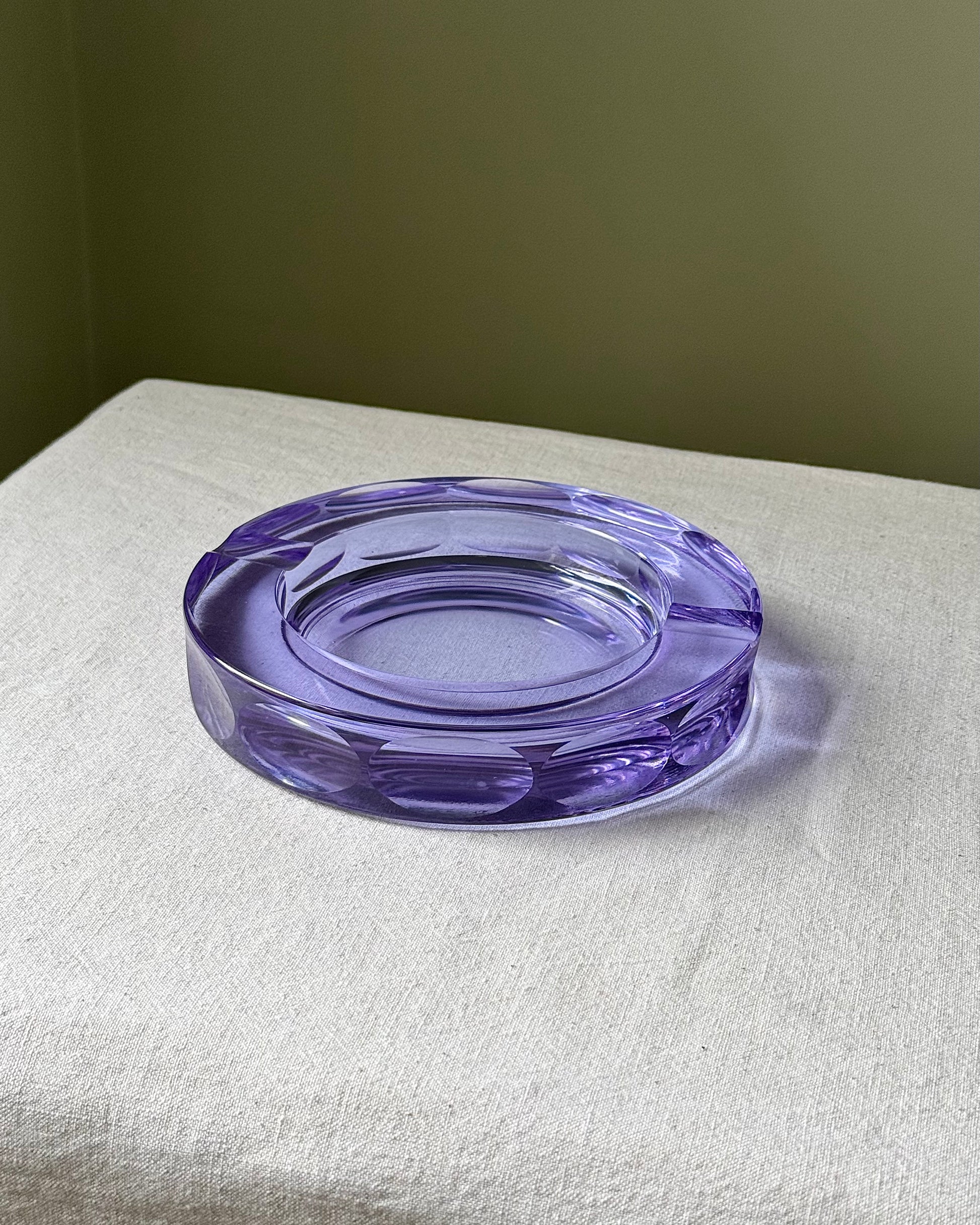 A beautiful French mid-century crystal ash tray with a violet hue and displaying circular detailing around the edge. A very heavy piece with great clarity. In good vintage condition with minimal signs of wear.