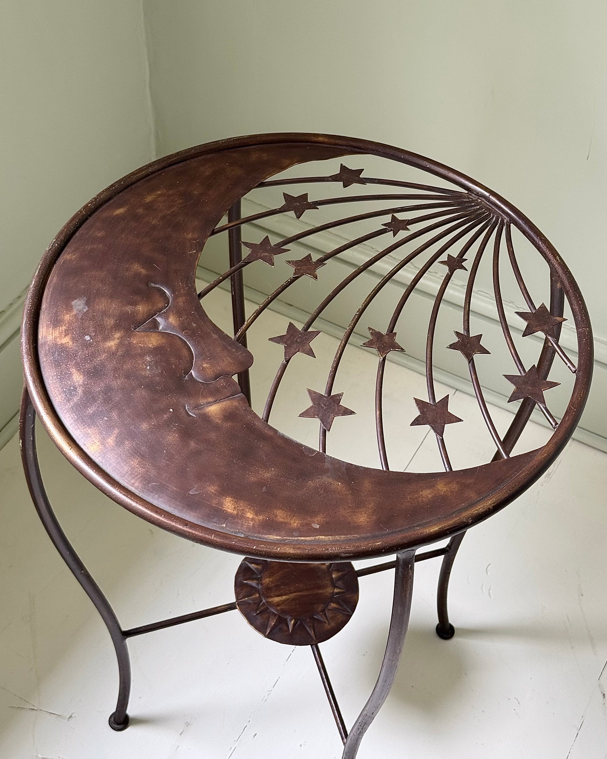 A rare and highly decorative French atelier-made wrought iron side table, crafted circa 1960’s. The open-work top displays a crescent moon surrounded by a starburst design, resting on sculptural curved legs joined by a star-form stretcher. In great vintage condition, beautifully hand-wrought with subtle irregularities that speak to its atelier production. Makes a fabulous accent side table in a living space or hallway.