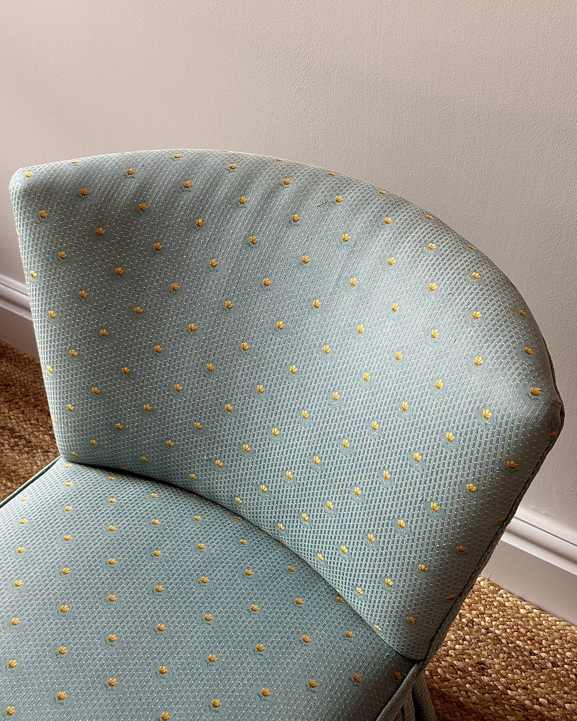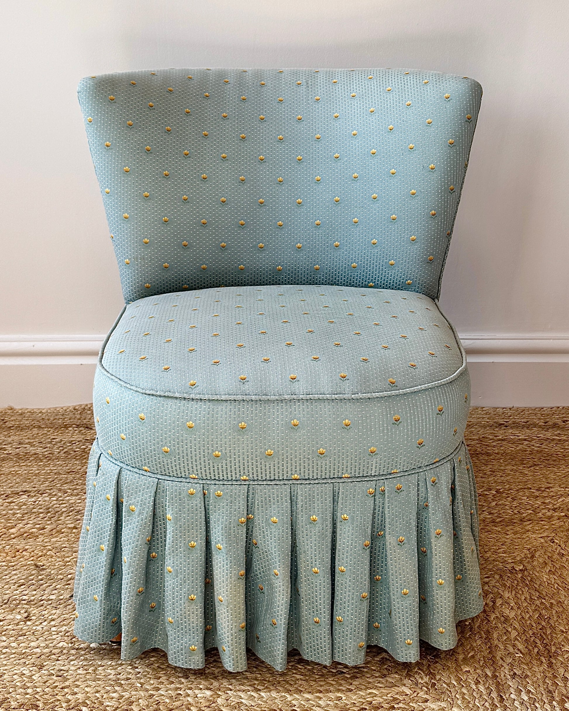 French mid-century slipper chair upholstered in a beautiful pale blue fabric, embroidered with delicate tulip motifs in three tones of yellow. There is such gorgeous detailing and depth to this fabric. The chair features a skirted base and the classic low, armless silhouette with a gently curved back and a generously cushioned seat.