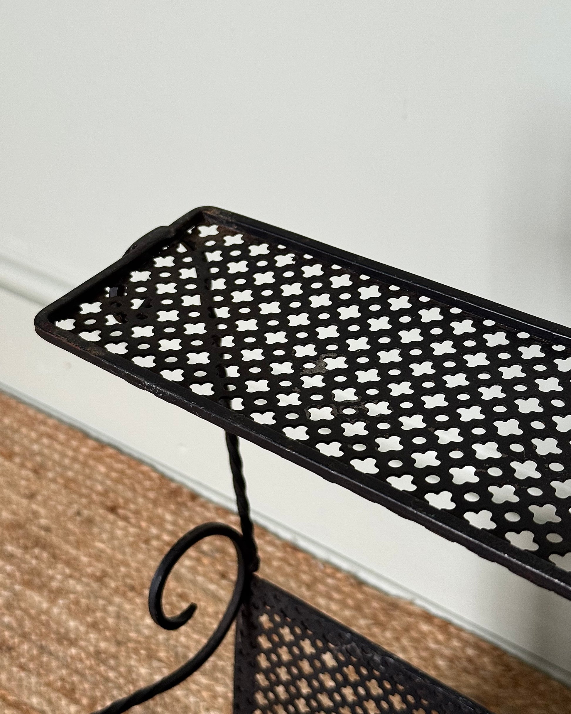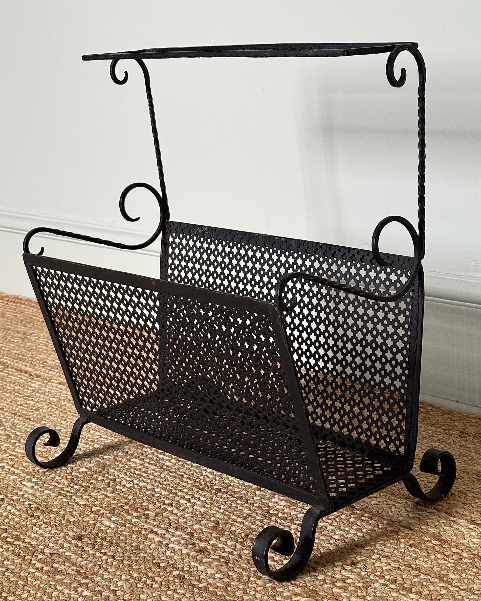 A French black magazine rack in the style of Mathieu Mategot. Made with wrought iron and perforated metal. Featuring two compartments, one for magazines and a small top shelf. Displaying coiled and twisted detailing on the sides and the feet. Perfect piece to style next to a sofa or armchair accessorise your living space.