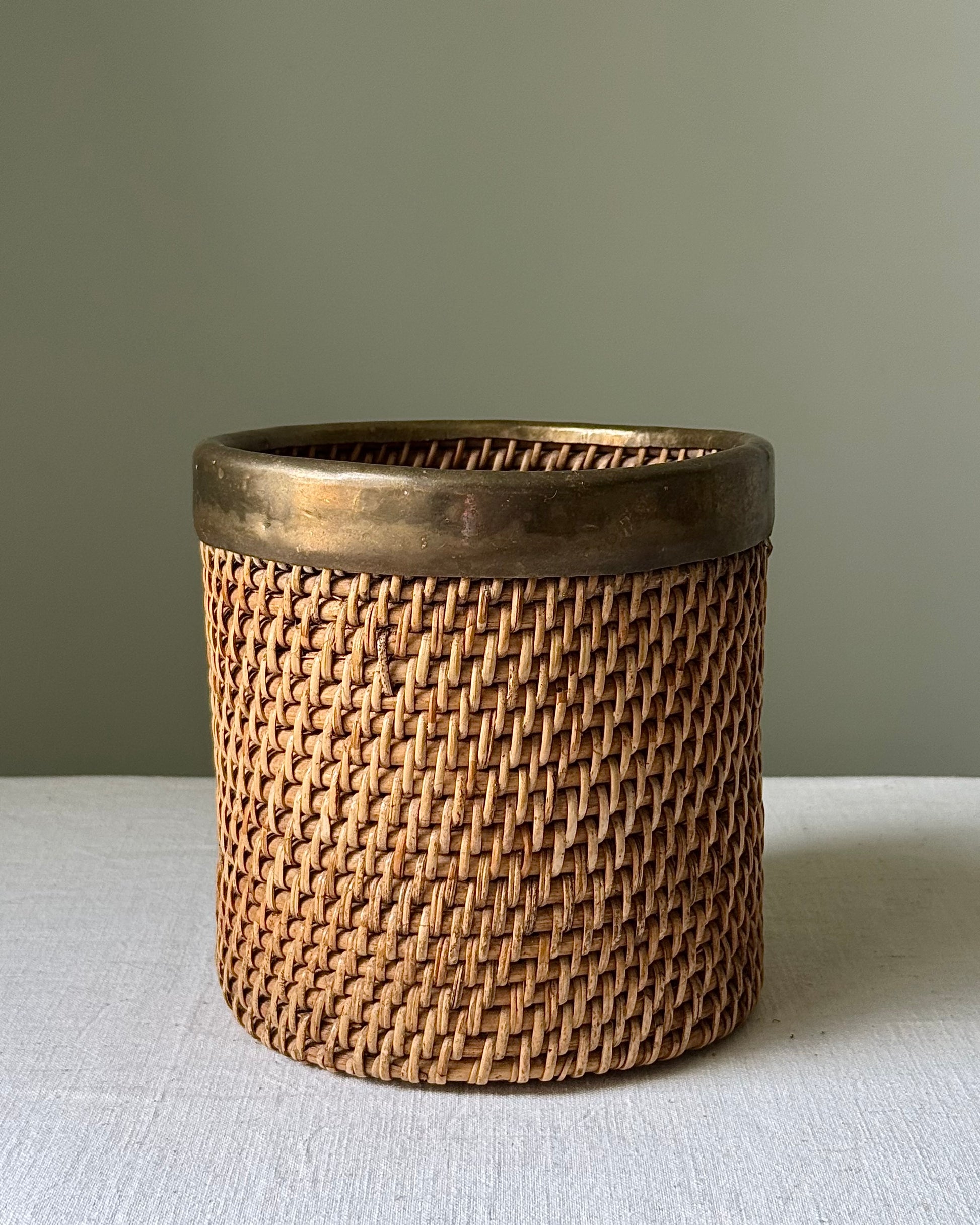 A chic 1970s Italian woven rattan basket, created in the style of Italian designer Gabriella Crespi. Featuring a brass rip with a beautiful warm patina. A great size for storage of items in a bathroom or bedroom, or simply as a decorative piece on a shelf. In good vintage condition.