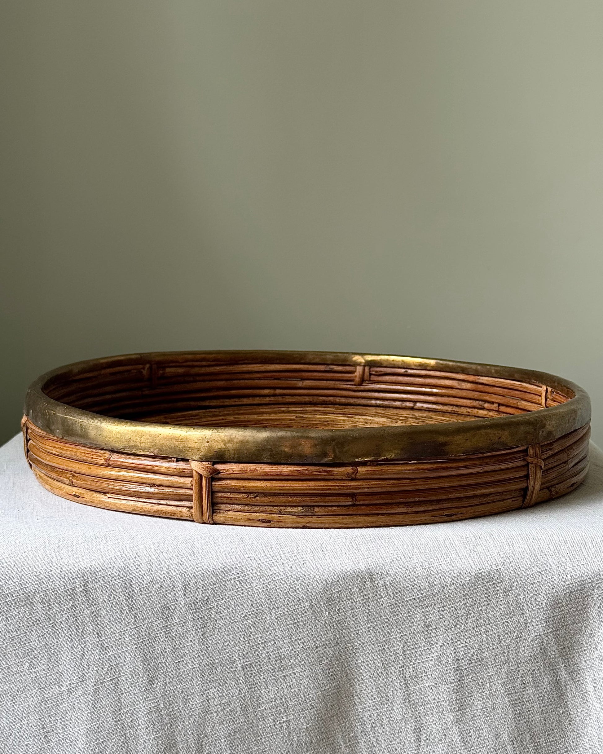 I have two available of these brilliant Italian 1970’s large round pencil reed tray, finished with a brass rim that has a warm aged patina. In the style of iconic Italian designer Gabriella Crespi. These look beautiful on a coffee table or sideboard, but are such versatile pieces they’d look great anywhere in a home! Kitchen, bathroom etc. They are in great vintage condition. Price is for one tray.