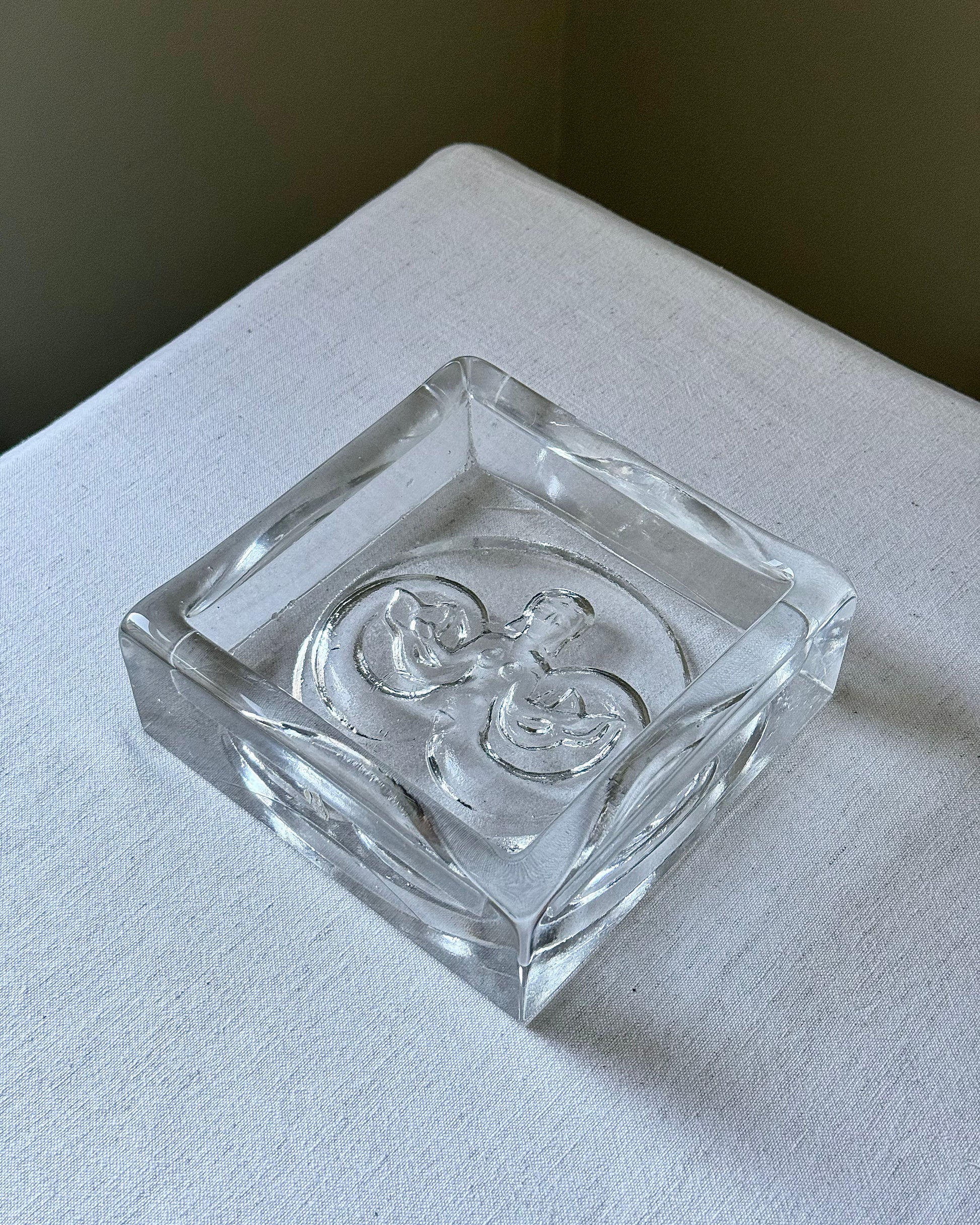 Large, very chunky and heavy (2.5kg) clear glass ashtray with a central stylised mermaid/siren motif on the base. Made by Ekenäs Glasbruk in Sweden circa 1980’s. Originally made to be an ash tray, however the scale of this piece also makes it perfect as a catch all on a bedside or console.