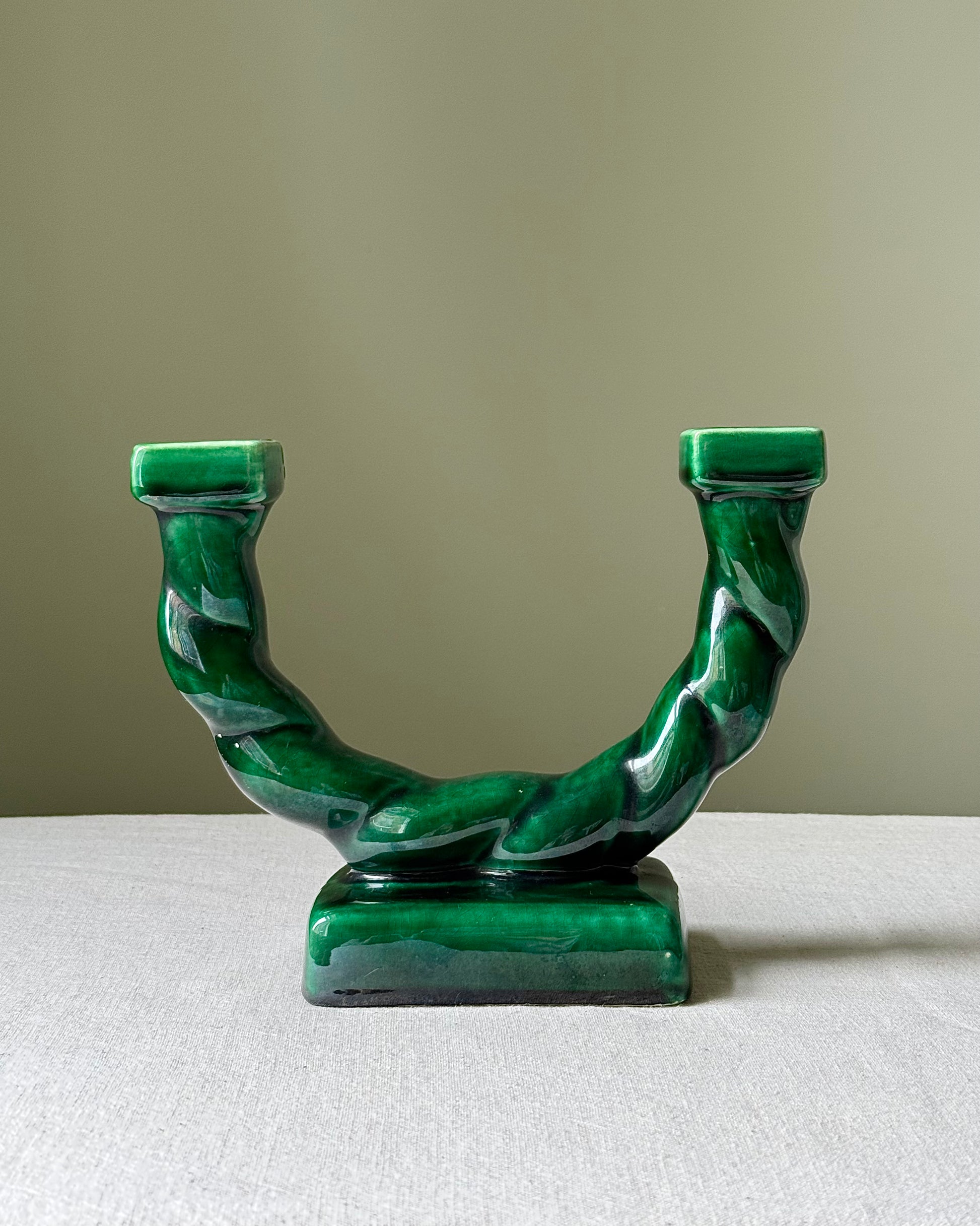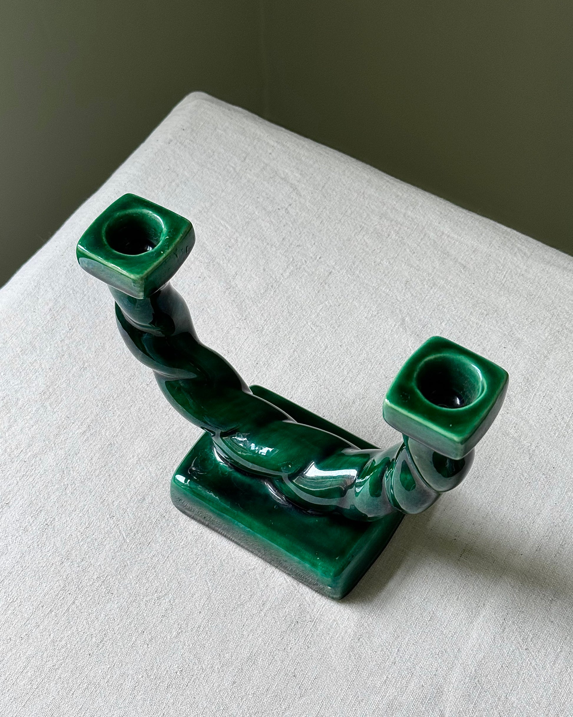 I have two of these very striking French circa 1950’s ceramic candlesticks by Longchamp, available individually or as a pair. Each featuring twisted double arm form, in a beautiful glossy green glaze. Both in good condition, no chips or cracks.