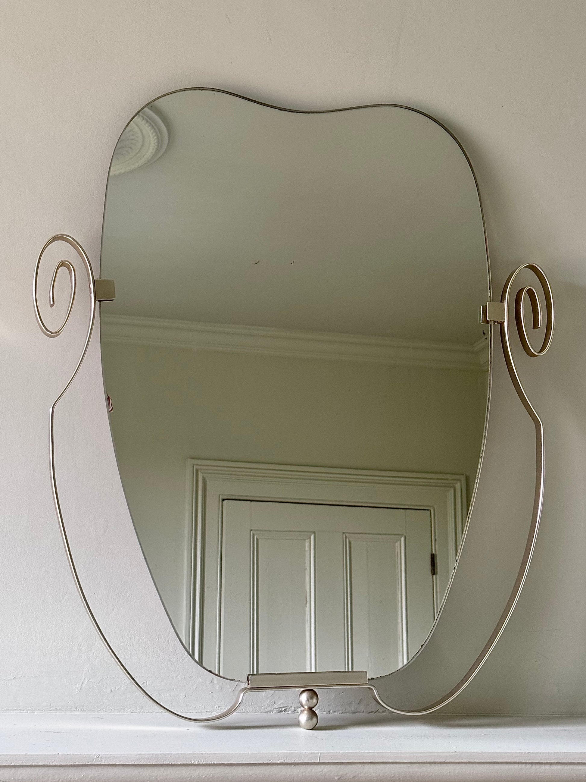 A unique decorative mid-century mirror from Belgium, circa 1960’s. Featuring a softly shaped shield mirror plate, which is floating in a silvered metal frame which displays scroll detailing either side and a small spherical finial at the base. In good vintage condition, with rope in the back ready to be hung. I can see this in a bathroom or hallway.