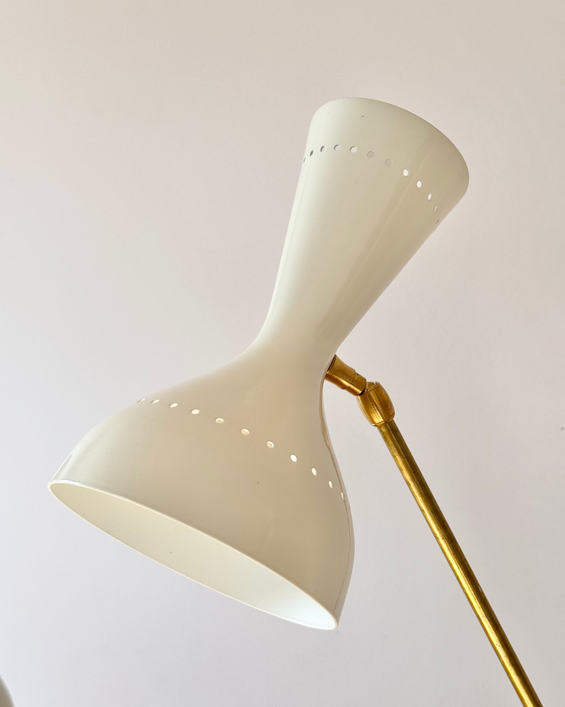 I have two available, individually or as a pair of these fabulous 1960s Italian diabolo lamps, after the original by Stilnovo. Displaying a lacquered off white perforated adjustable metal double cone shade. Reaching from a long brass arm which is counterbalanced by a spherical white marble weight at the base, allowing the angle to be adjusted as shown in the images. In excellent condition.