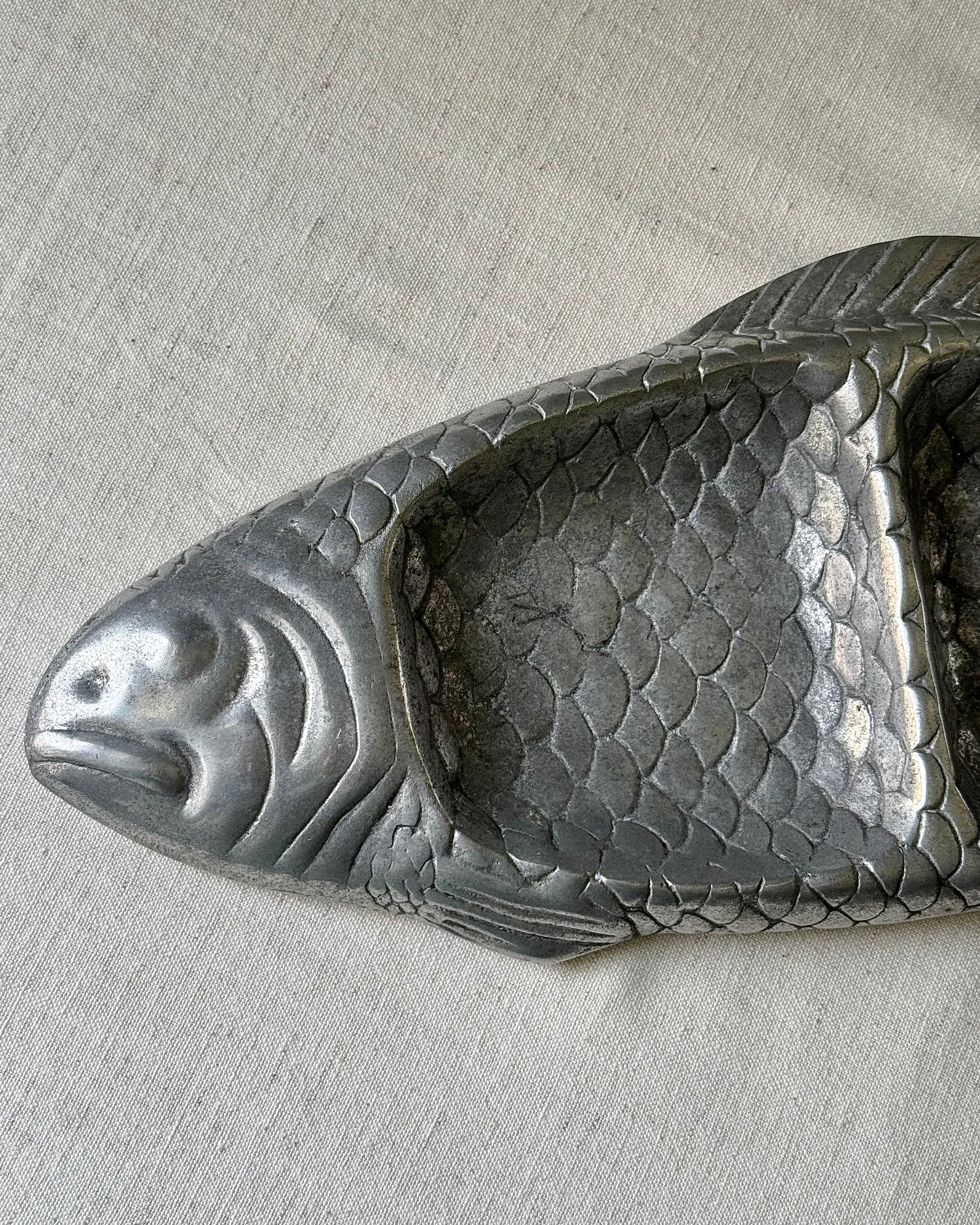 A vintage serving platter in the form of a fish, cast with detailed scales and tail. The body is divided into three compartments. In good vintage condition.