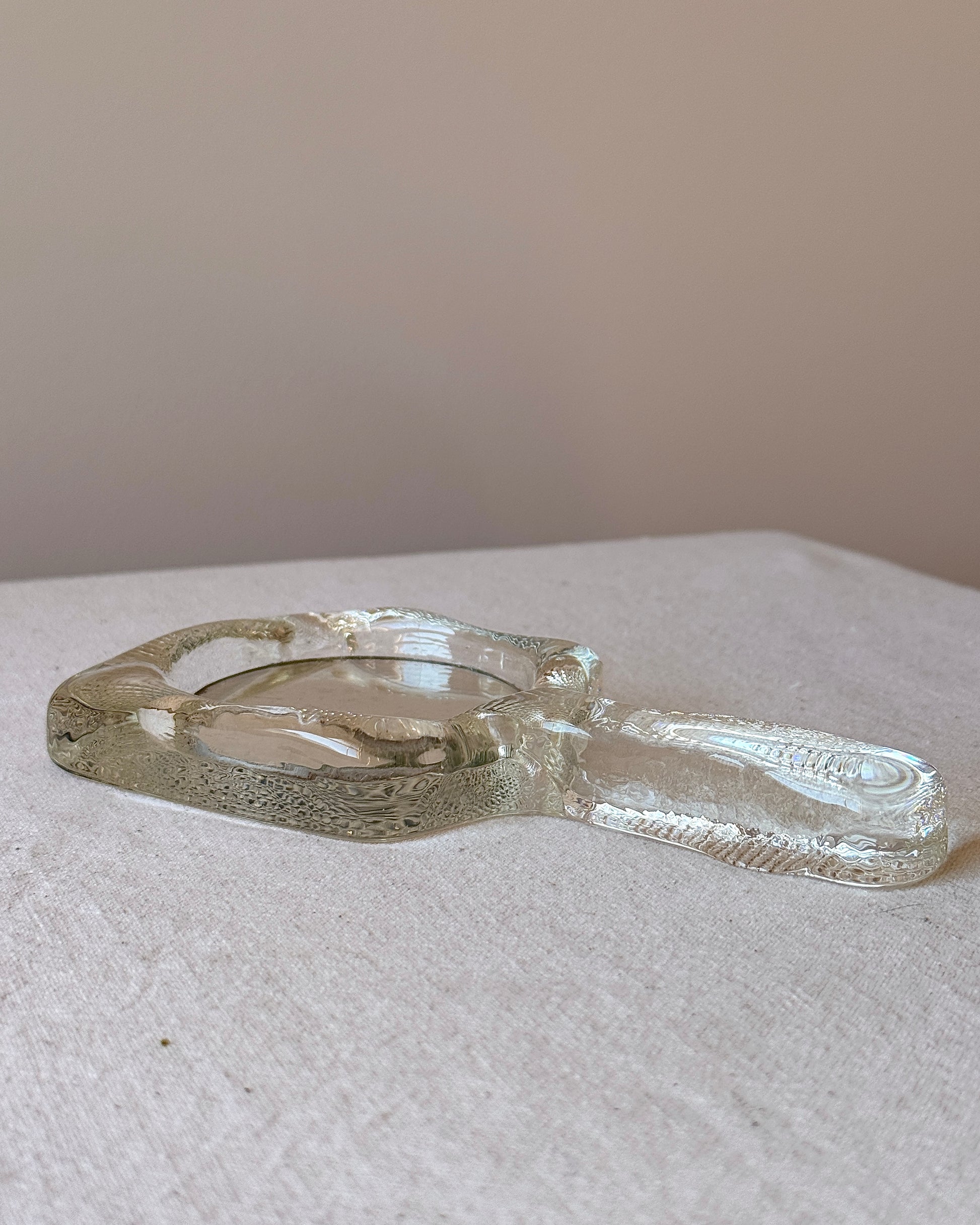Sculptural hand mirror in solid clear glass by Pukeberg, Sweden, circa 1960’s. The frame is cast in thick, textured clear glass with a rounded profile and a gently tapered handle that feels beautifully weighty in the hand. Original maker label still intact. Lovely on a dressing table or bedside, but also works as a decorative object on a stack of books or a bathroom shelf. Foxing to the glass but overall good condition with no cracks or chips.