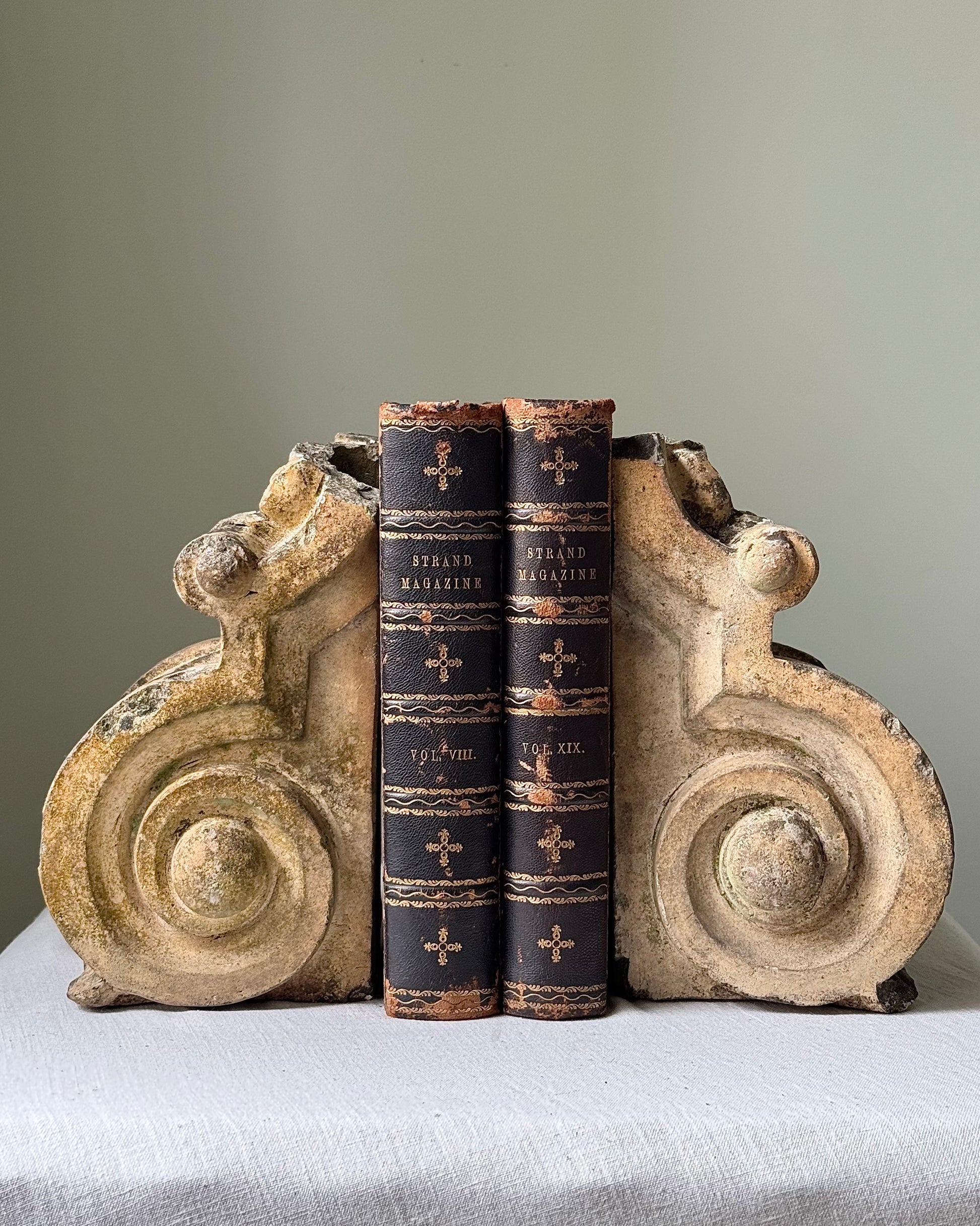 A striking pair of antique carved stone bookends, salvaged from original 19th century architectural stone corbels. Each piece retains traces of original weathered patina and age-related wear. I adore the sculptural scroll design and love how these have been repurposed into these fantastic decorative weighty bookends.