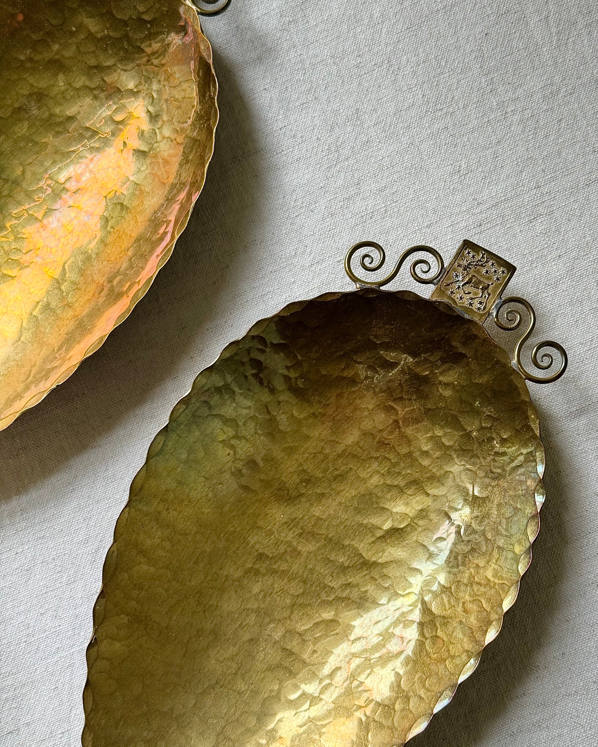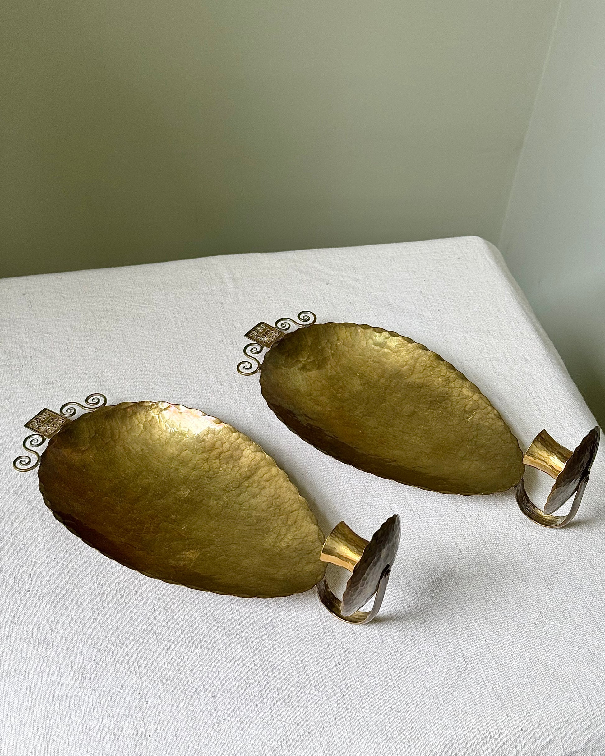 A pair of Swedish brass candle sconces, with a hand hammered surface, coiled detailing and a reindeer motif at the top. Will make a beautiful Christmas decoration, but as the reindeer motif is so small, it’s not very noticeable so could be used throughout all seasons. In good condition with a metal ring for hanging.