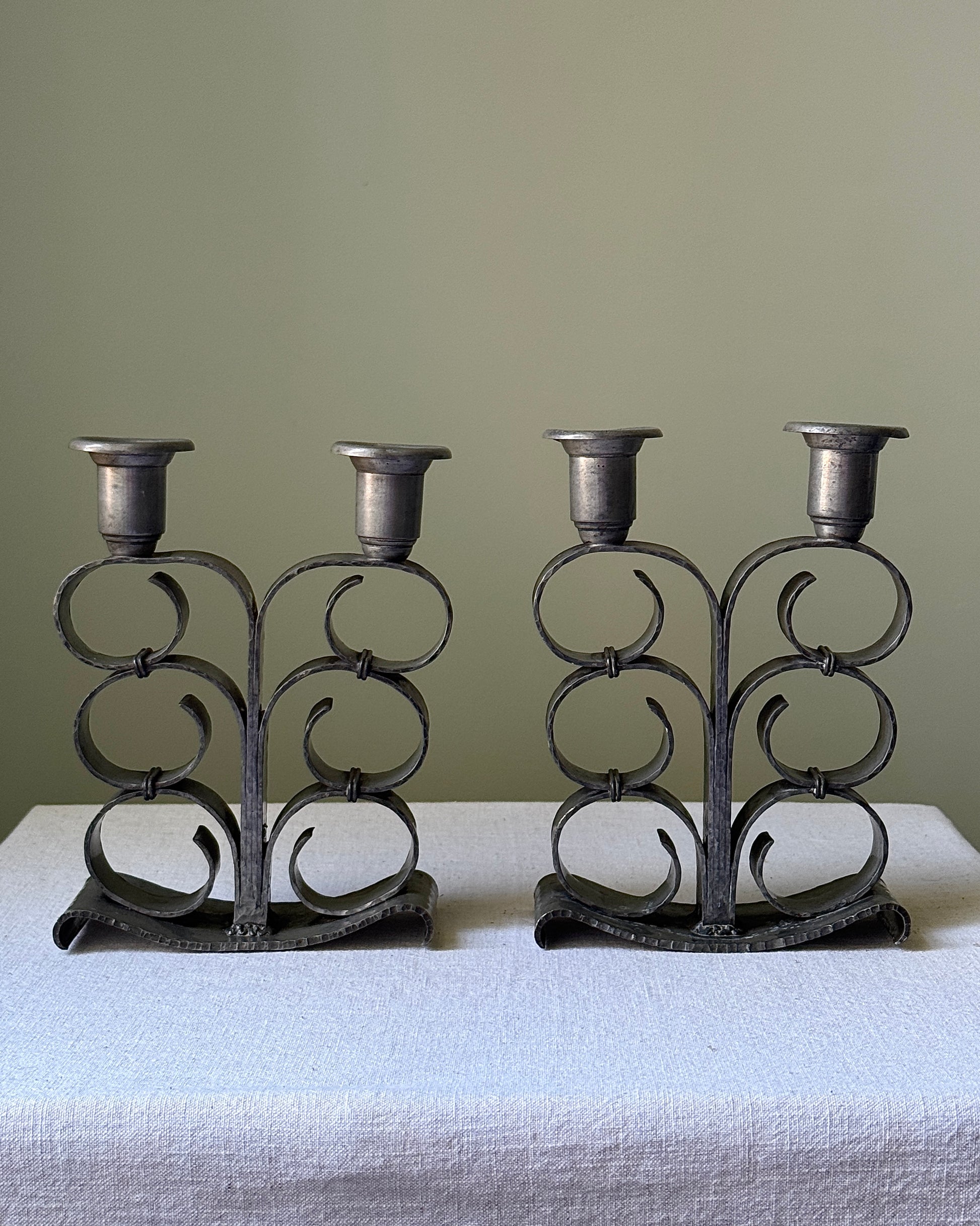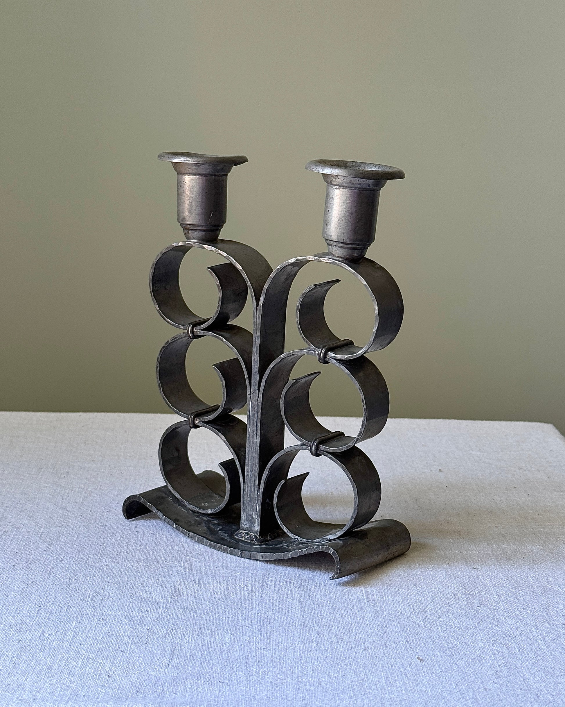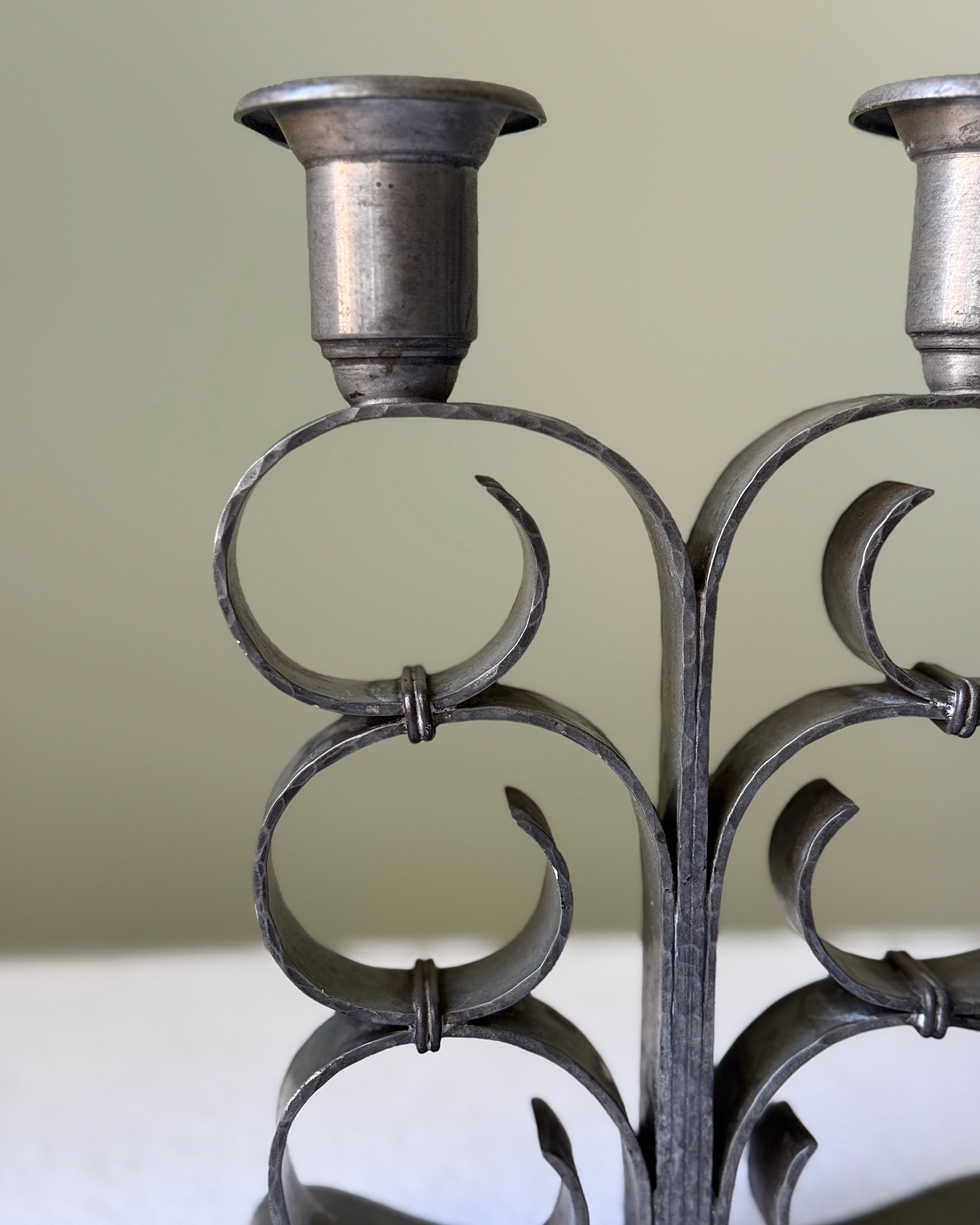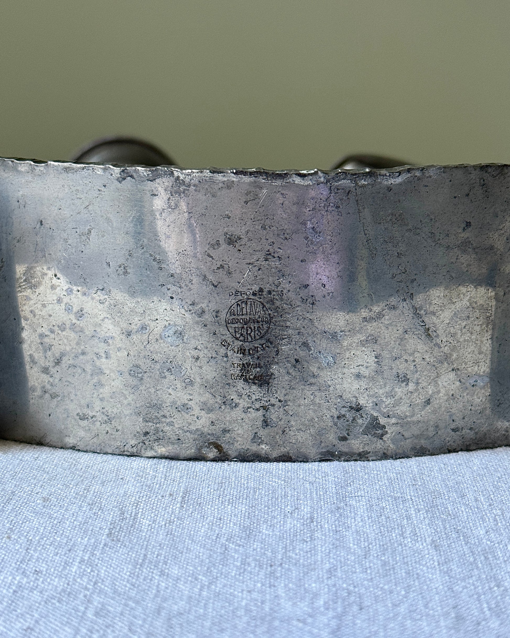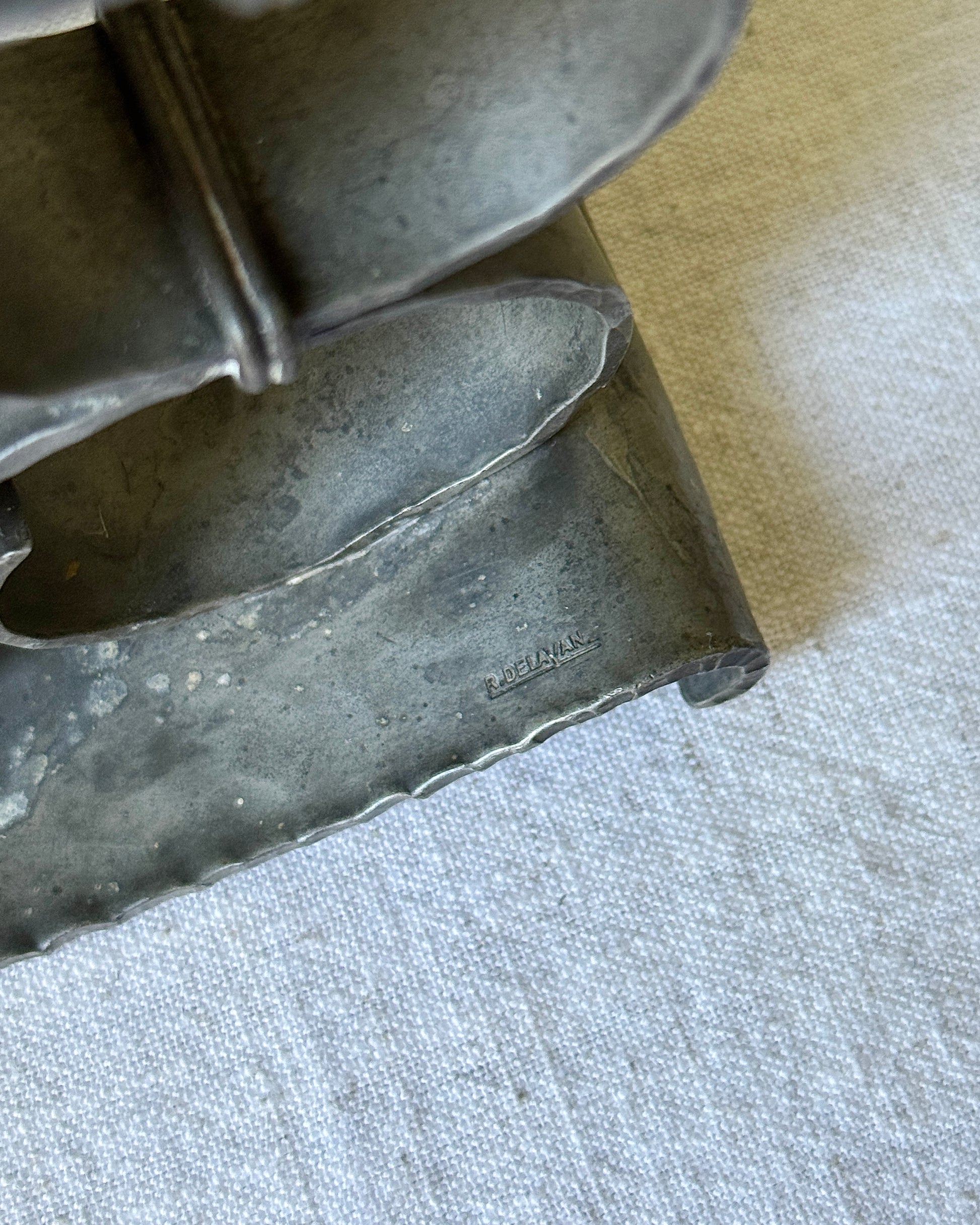 A pair of rare French pewter candlesticks, signed Delavan circa. 1950’s. Their design features there circular scrolls stacked on a base with curled feet with a hammered finish. These have signs of wear consistent with their age, the backs of the candle holders have bent a little but this is not noticeable and does not take away from the uniqueness of this piece.