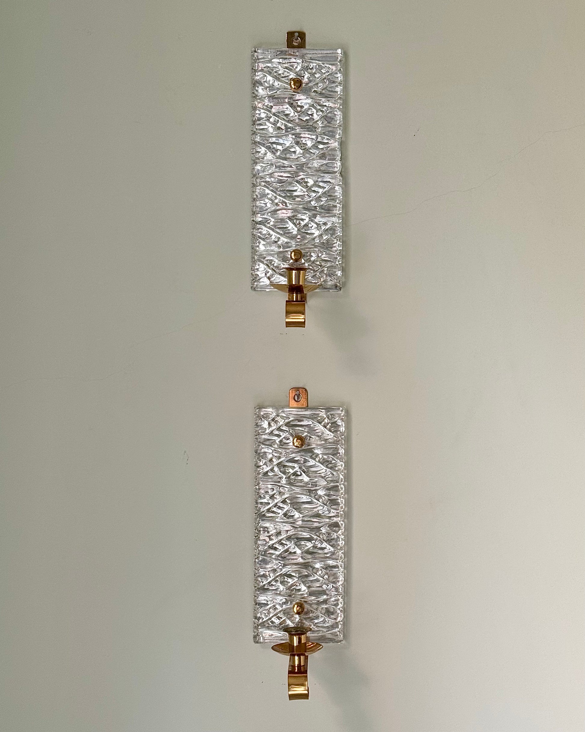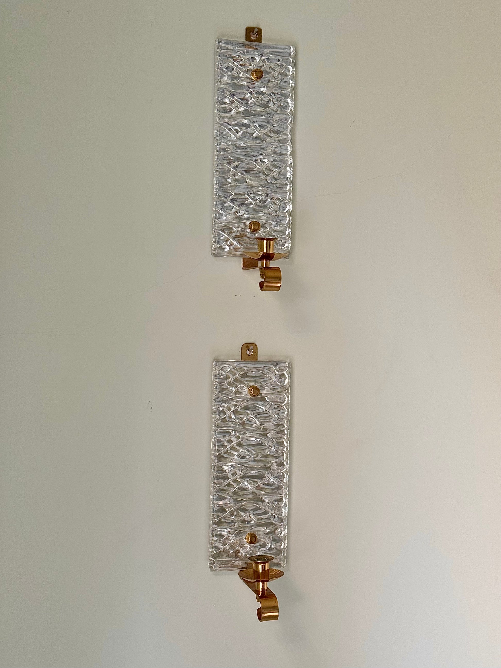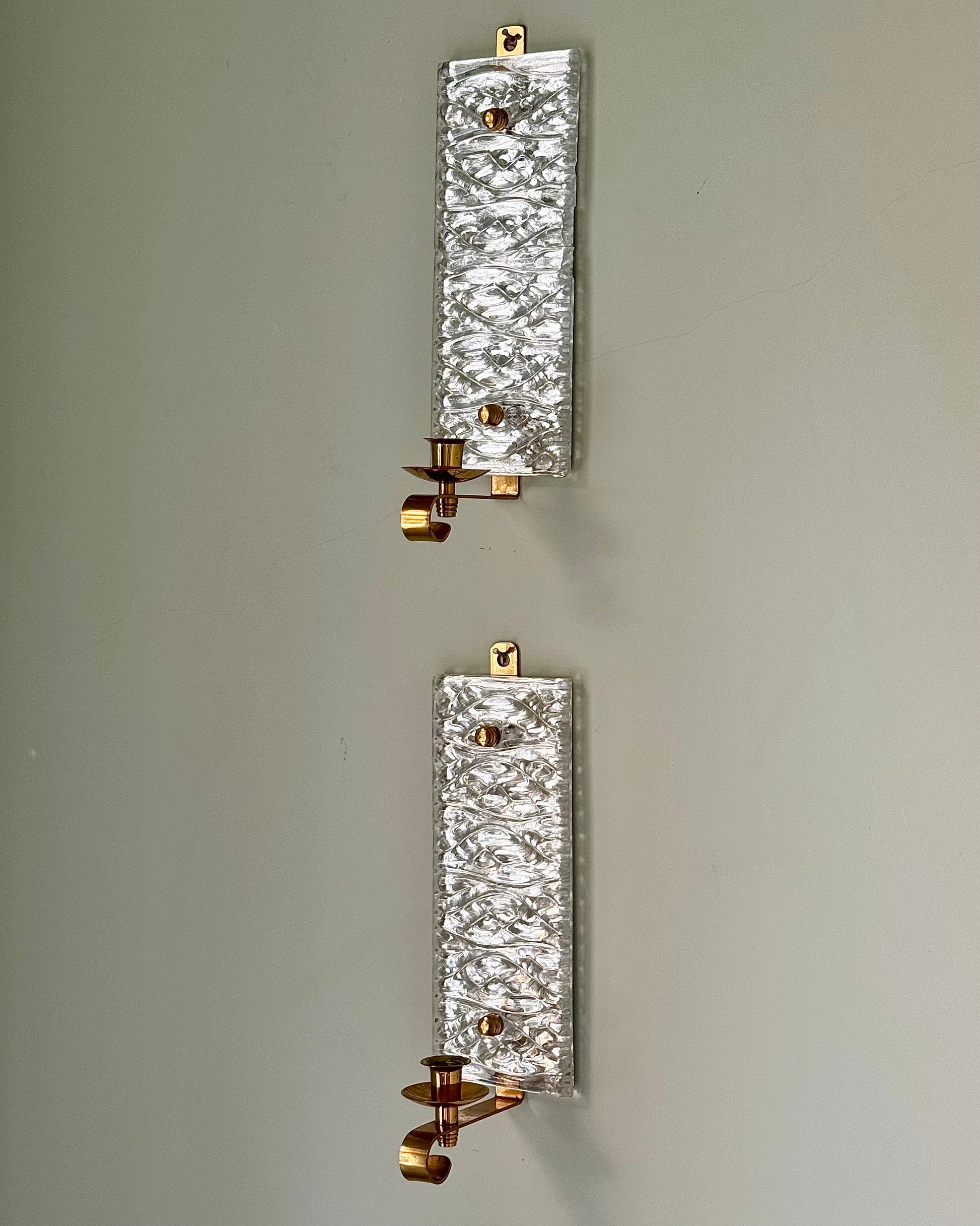 A beautiful and rare pair of Swedish mid-century wall sconces by Malmö Metallvarufabrik AB. Displaying textured irregular raised glass panels mounted on brass fittings with a brass coiled candle holder. When lit, due to its design, light is captured and scatters beautifully creating a warm, ambient glow. The original makers sticker remains to the back.