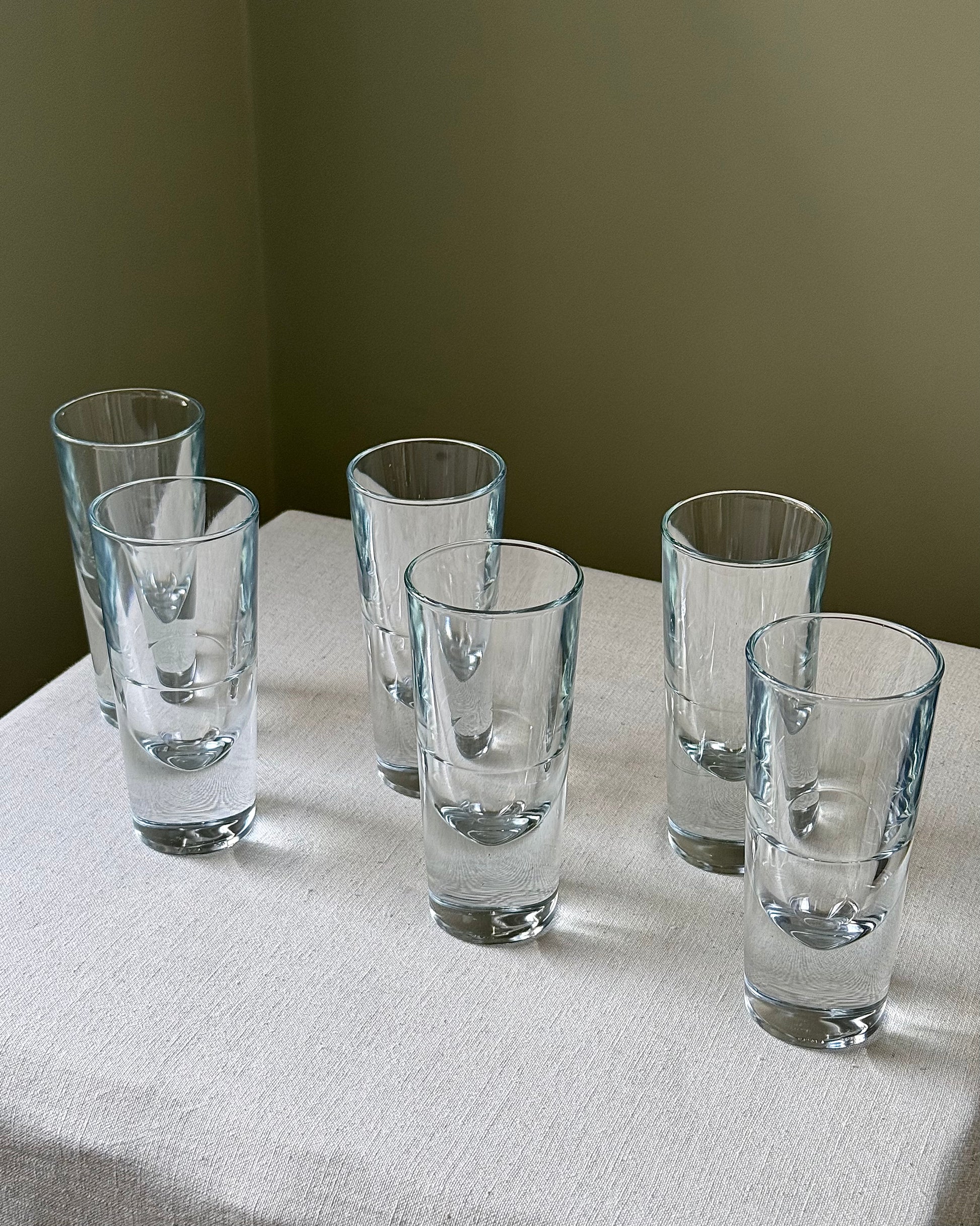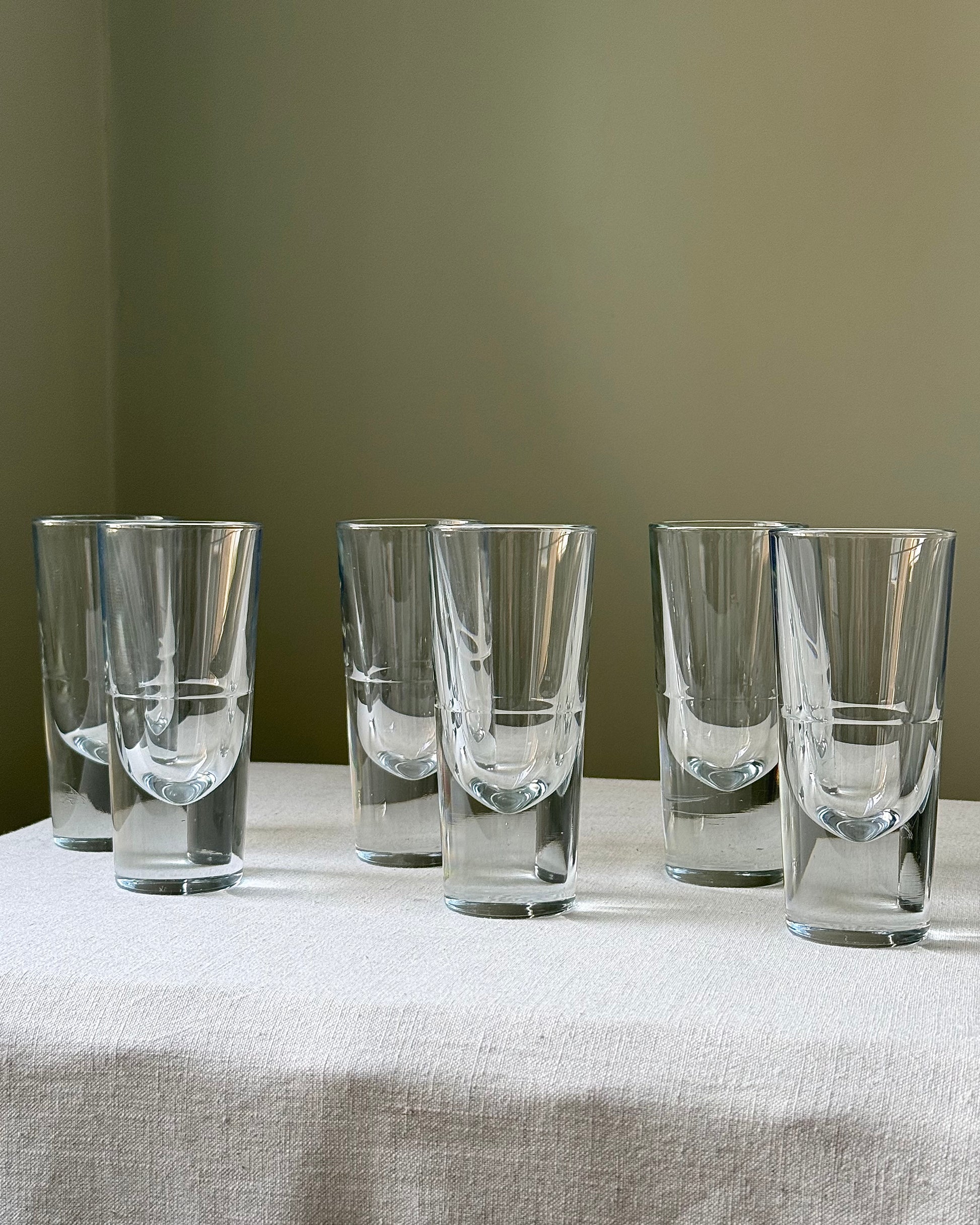 A set of 6 Carlo Moretti “Bullet” glasses, handblown in Murano circa 1970s. Weighted and minimal in design, ideal to use as aperitif or shot glasses. In good vintage condition, no chips or cracks.