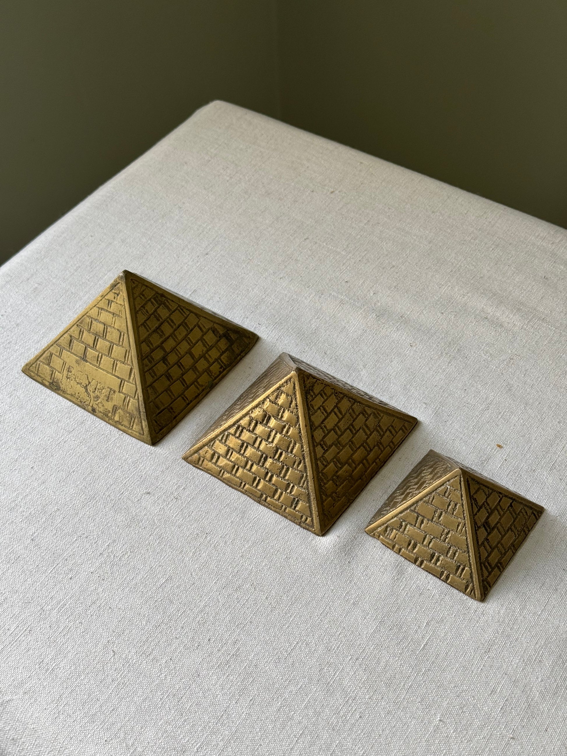 A trio of enraged brass pyramids in various sizes. Make great decorative objects styled together or separately. In good vintage condition.