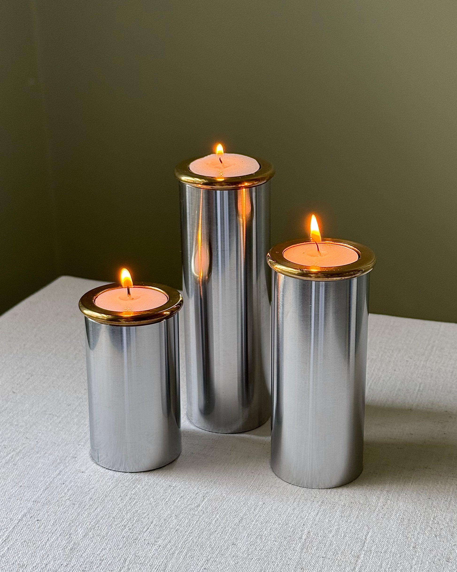 A trio of Swedish minimalist tealight holders in brushed steel and brass tops in the manner of Staffan Englesson, circa 1970s. Very nicely balanced with graduated heights. I love the combination of cool steel and warm brass. In good vintage condition.