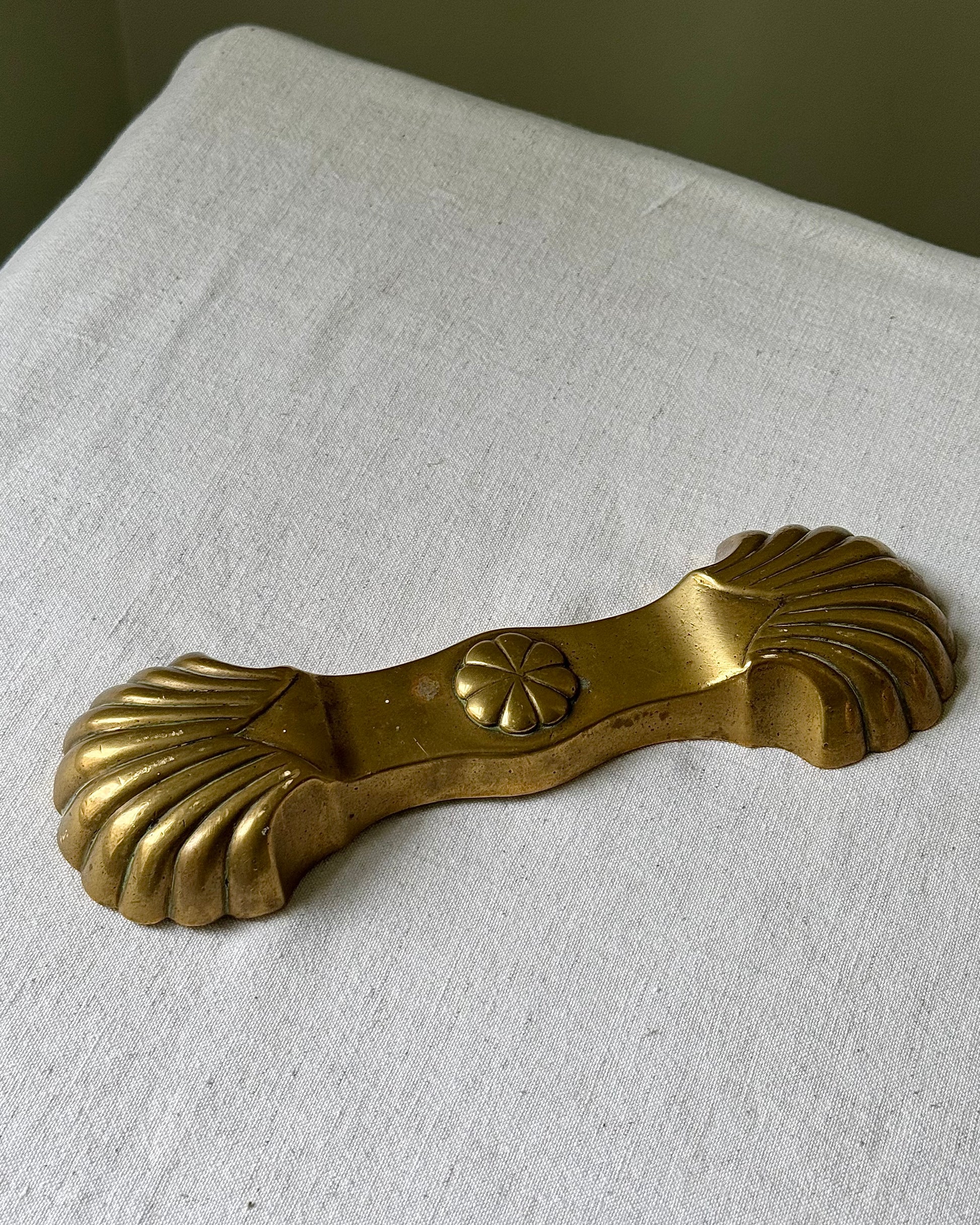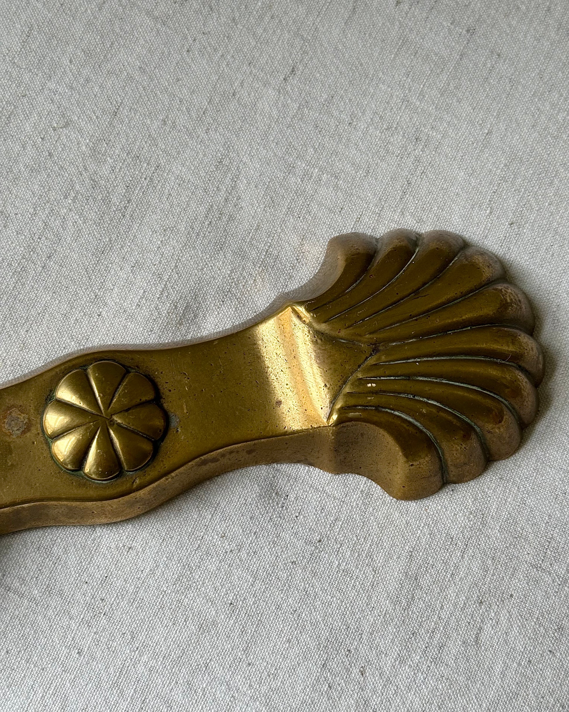 A beautifully detailed late 19th-century solid brass weighted doorstop. Displaying shell motif either end with a central flower. Incredibly warm patina, it’s beautiful yet functional! In good antique condition with wear aligned with age.